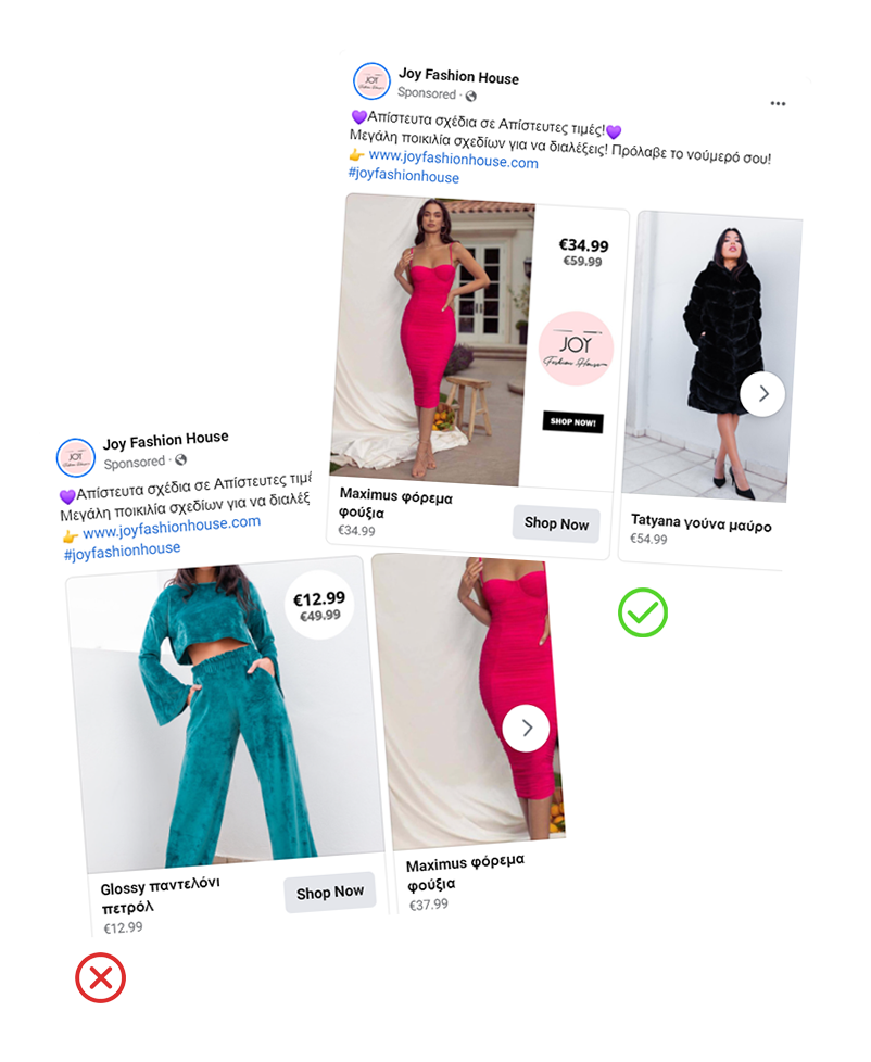 To improve the performance and ROI of the already active Facebook and Instagram campaigns for Joy Fashion House, we needed to make sure that the products were showcased in the best possible way.