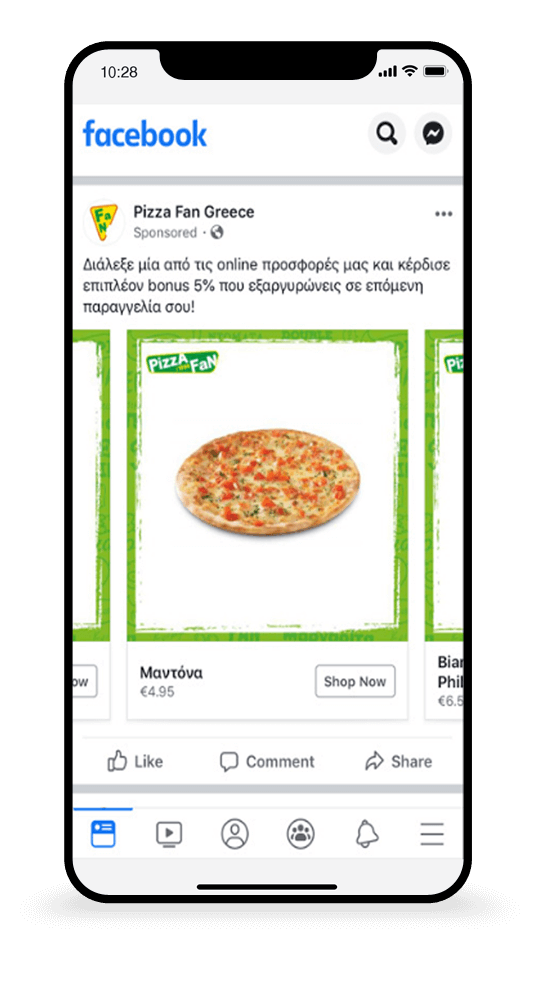 Pizza Fan then ran dynamic ads in carousel format, showing people their favourite pizzas and appealing deals. An “Order Now” call-to-action button made it easy for people to go ahead and place an order. The ads ran in Facebook News Feed, Instagram feed and via Audience Network.